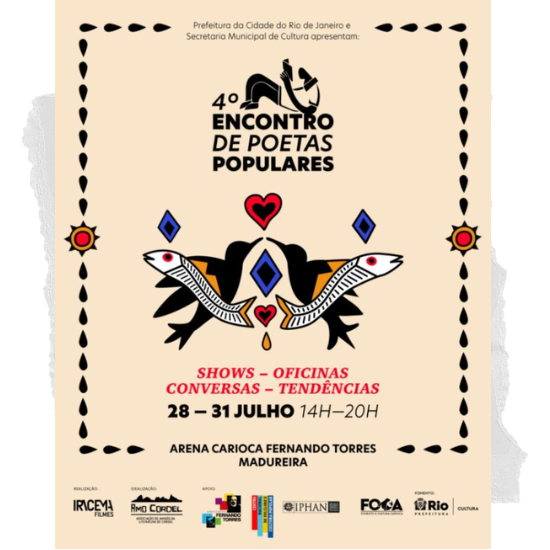 Contemplado pelo edital FOCA da Secretaria Municipal de Cultura do Rio de Janeiro, o 4º Encontro de Poetas Populares Realizado entre os dias 28 e 31 de julho de 2022, na Arena Carioca Fernando Torres, no Rio de Janeiro, o 4º Encontro de Poetas Populares reuniu artistas, pesquisadores, educadores e amantes da cultura popular em quatro dias de programação totalmente gratuita.